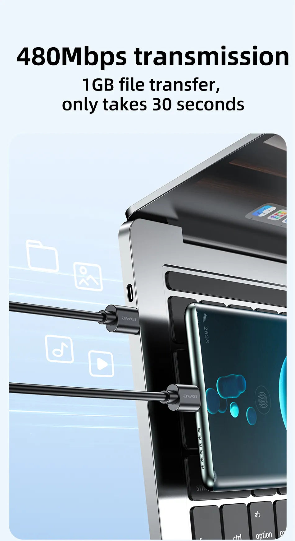 Cable de carga rápida AWEI de tipo C a tipo C de 1 m